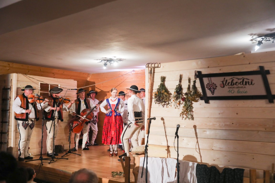 Równocześnie z Oddziałem Związku Podhalan powstał w 1984 r. w Groniu-Leśnicy regionalny zespół, którym kierował w latach 1984-1989 pierwszy prezes O. ZP Marian Bryja. Po nim kierownikiem „Ślebodnych” był Jan Łaś (1990 – 2000), następnie Maria i Józef Dudkowie (2000-2004), a od 2000 roku nieprzerwanie zespół prowadzi Maria Dudek. Kobieta wielu talentów (malarstwo, poezja, proza itd.) świętowała z zeszłym roku jubileusz młodszego zespołu „Zawaternik”, później obchodziła jubileusz swej działalności artystycznej a w niedzielę 27.10.br. w remizie OSP w Leśnicy świętowała z zespolanami i zaproszonymi gośćmi kolejny jubileusz – 40-lecie działalności artystycznej zespołu „Ślebodni”. Oprócz tańca członkowie zespołu przedstawili zebranym 2 krótkie sztuki teatralne. W uznaniu zasług ZG ZP przyznał zespołowi góralskiemu „Ślebodni” Medal Związku Podhalan, który wręczył kierownictwu zespołu prezes ZP.