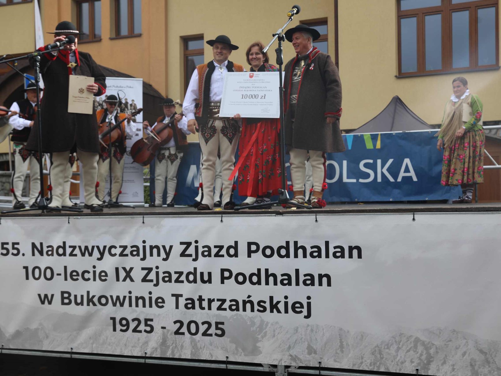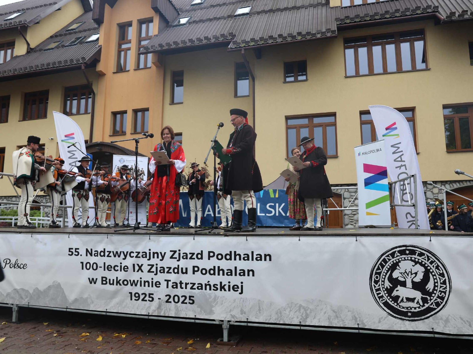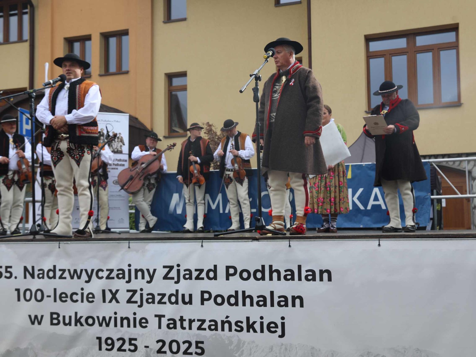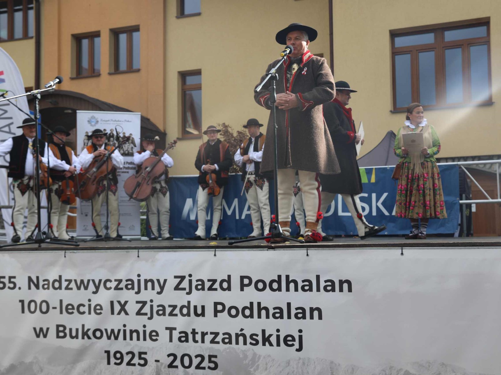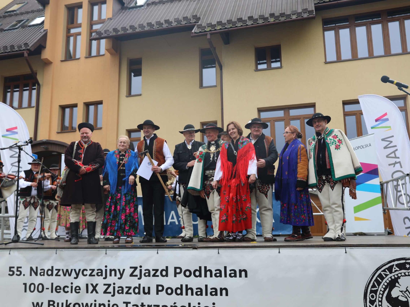Po uroczystej mszy św. na placu szkoły podstawowej, podobnie jak 100 lat temu, odbyła się oficjalna część jubileuszu Zjazdu Podhalan w Bukowinie T. Głos zabrali: gość honorowy Marszałek Województwa Małopolskiego Łukasz Smółka, prezes ZG Związku Podhalan w Polsce Julian Kowalczyk, przewodniczący Rady Naukowej przy Związku Podhalan prof. Stanisław Hodorowicz, prezes Związku Polskiego Spisza Jan Budz. Przedstawiciel zasłużonej rodziny Ćwiżewiczów otrzymał z rak prezesa ZP symboliczne eptitafium (pośmiertne wyróżnienie za działalność na rzecz promocji regionu). Z kolei w dowód uznania za zaangażowanie Urzędu Marszałkowskiego za wspieranie i promowanie polskiej góralszczyzny Marszałek Smółka otrzymał od ZP góralski serdak i i kilka innych części góralskiego uposażenia. Zanim w barwnym korowodzie uczestnicy Zjazdu udali się do Domu Ludowego w Bukowinie T. Marszałek Ł. Smółka zapozował do pamiątkowej fotografii z naszymi pocztami sztandarowymi.