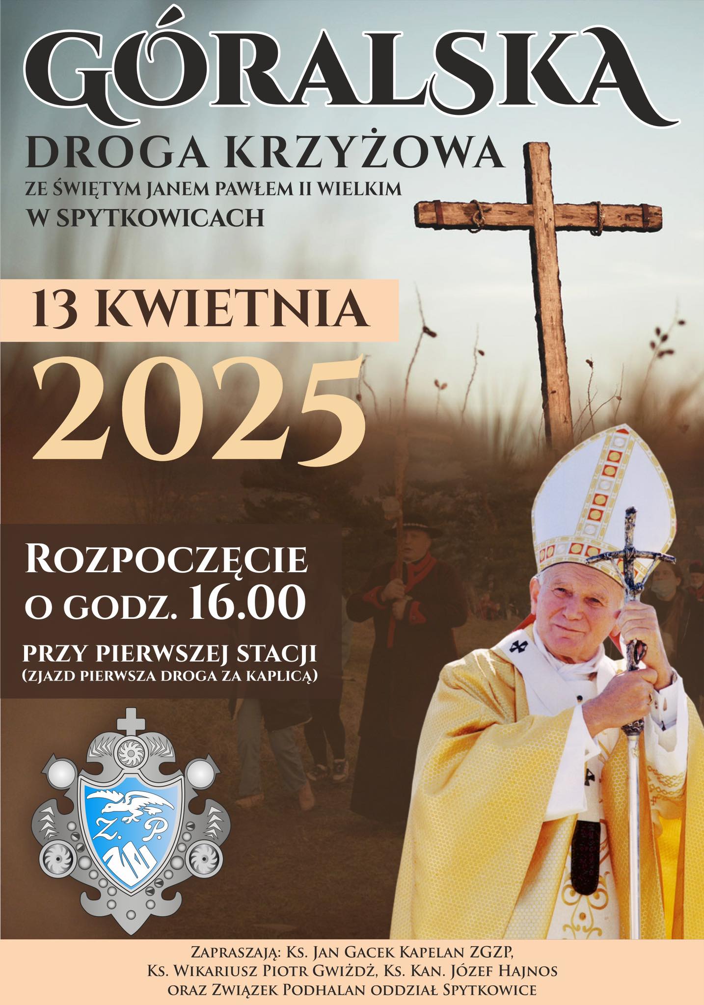 Serdecznie zapraszamy na Góralską Drogę Krzyżową w Spytkowicach na Golgotę. Wydarzenie odbędzie się 13 KWIETNIA 2025r. o godz. 16:00. Rozpoczęcie przy pierwszej stacji drogi krzyżowej tj. obok domu nr 284b. Zachęcamy do udziału w stroju ludowym.