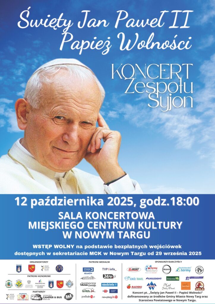 Urząd Miasta w Nowym Targu, Starostwo Powiatowe w Nowym Targu, Miejskie Centrum Kultury w Nowym Targu oraz Bełchatowskie Stowarzyszenie Miłośników Muzyki Chrześcijańskiej SYJON serdecznie zapraszają na Koncert pt. ,,Święty Jan Paweł II – Papież Wolności’’, który odbędzie się 12 października (niedziela) 2025 roku, o godz. 18:00 w Sali koncertowej Miejskiego Centrum Kultury w Nowym Targu.