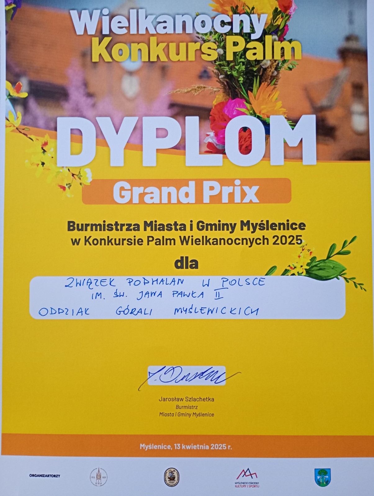 Z ogromną radością informujemy, że Oddział Myślenice zdobył nagrodę Grand Prix w prestiżowym Konkursie Palm Wielkanocnych, organizowanym przez Burmistrza Miasta i Gminy Myślenice – Jarosława Szlachetkę.