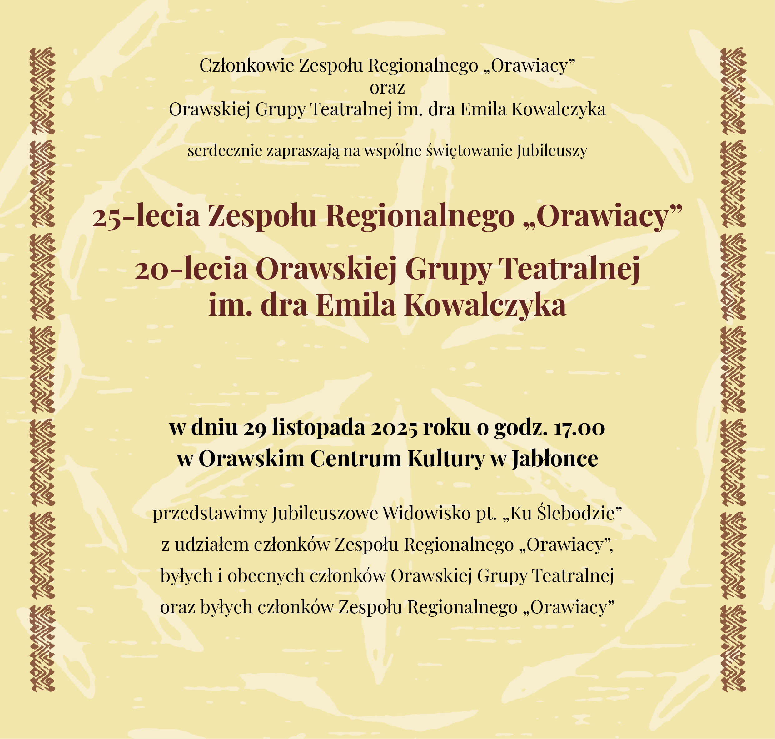 członkowie Zespołu Regionalnego „Orawiacy” oraz Orawskiej Grupy Teatralnej im. dra Emila Kowalczyka mają zaszczyt zaprosić Państwa na uroczyste obchody 25-lecia Zespołu Regionalnego „Orawiacy” oraz 20-lecia Orawskiej Grupy Teatralnej im. dra Emila Kowalczyka.