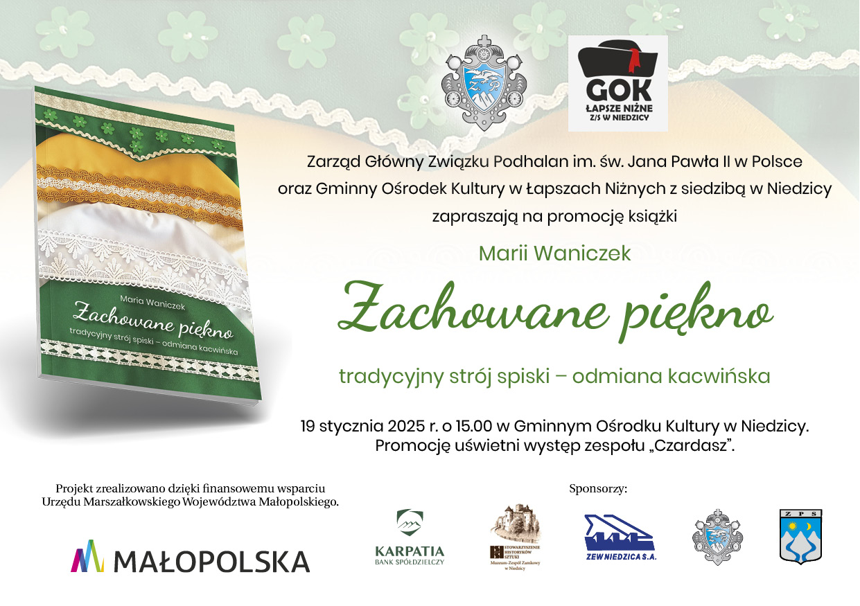 Zarząd Główny Związku Podhalan im. Św. Jana Pawła II w Polsce oraz Gminny Ośrodek Kultury w Łapszach Niżnych z siedzibą w Niedzicy zapraszają na promocję książki Marii Waniczek „Zachowane piękno” tradycyjny strój spiski- odmiana kacwińska.